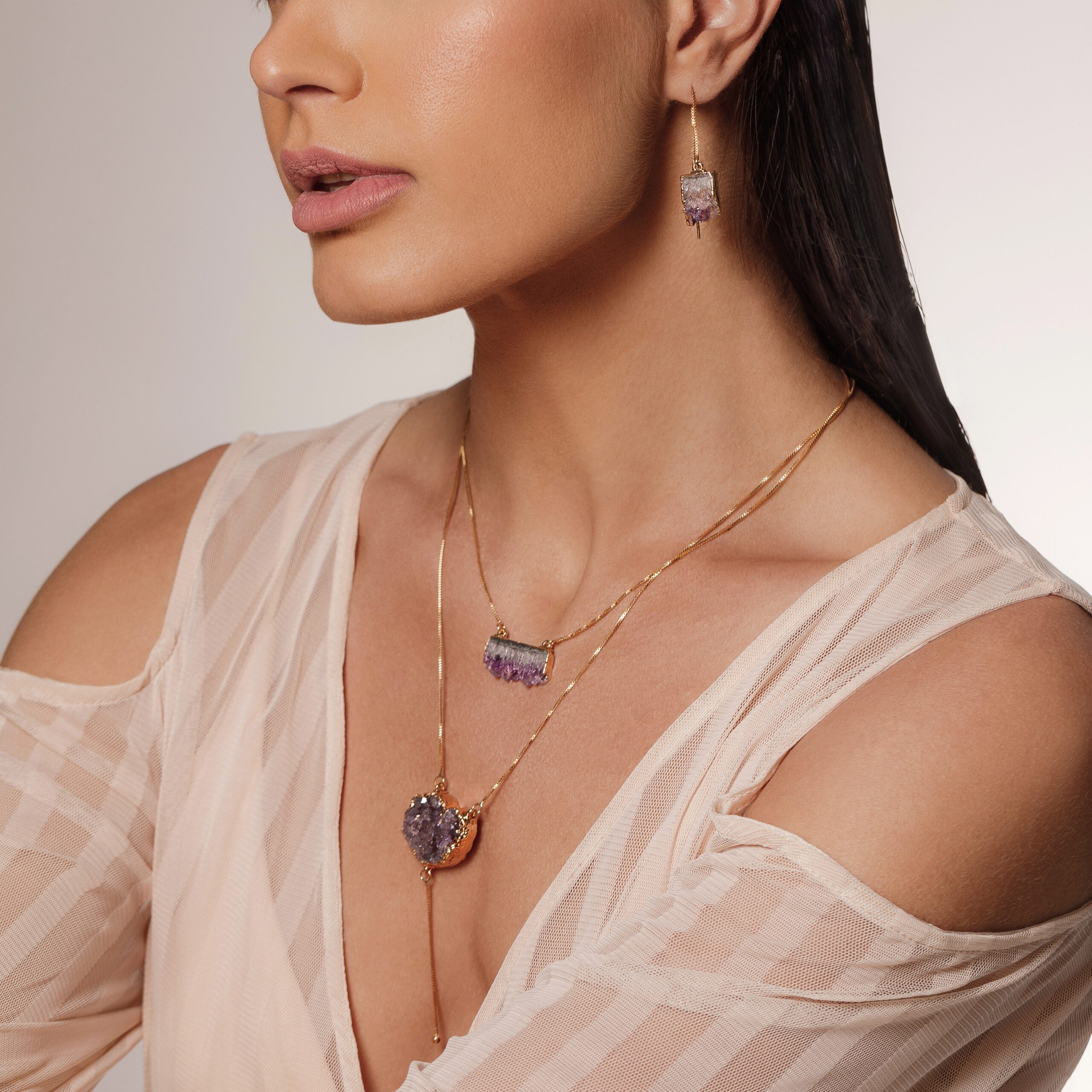 Earring with a natural stone, extracted from the inside of an amethyst, featuring druse details, rectangular shape, and varying sizes; the stones range from 1.5cm to 2cm. thus becoming a unique piece. With a modern design, it has no backing; its post has a 5cm Venetian chain, thus diversifying its use.