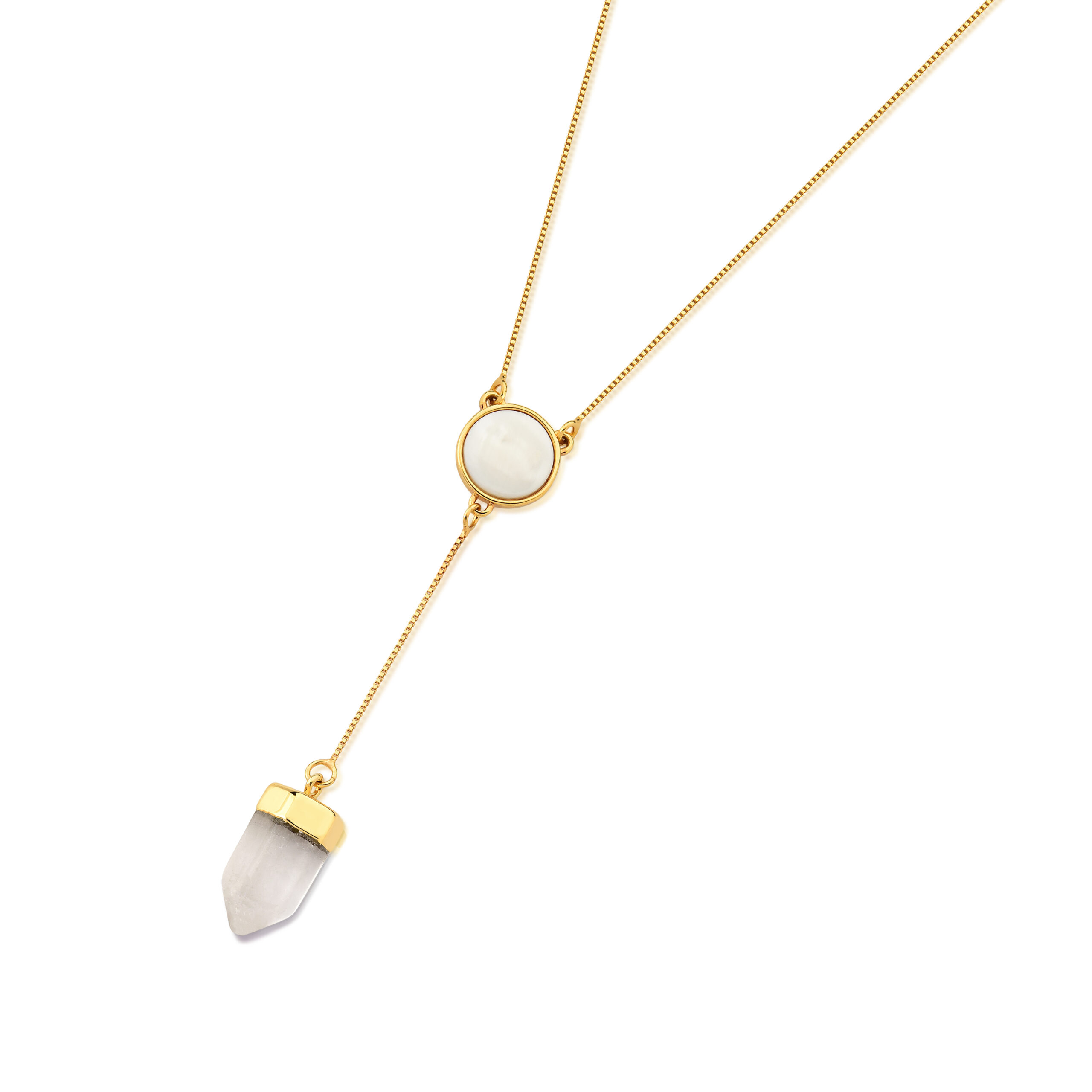 Pendant with a 12mm round cabochon stone in the center and a prism-shaped crystal stone at the tip.