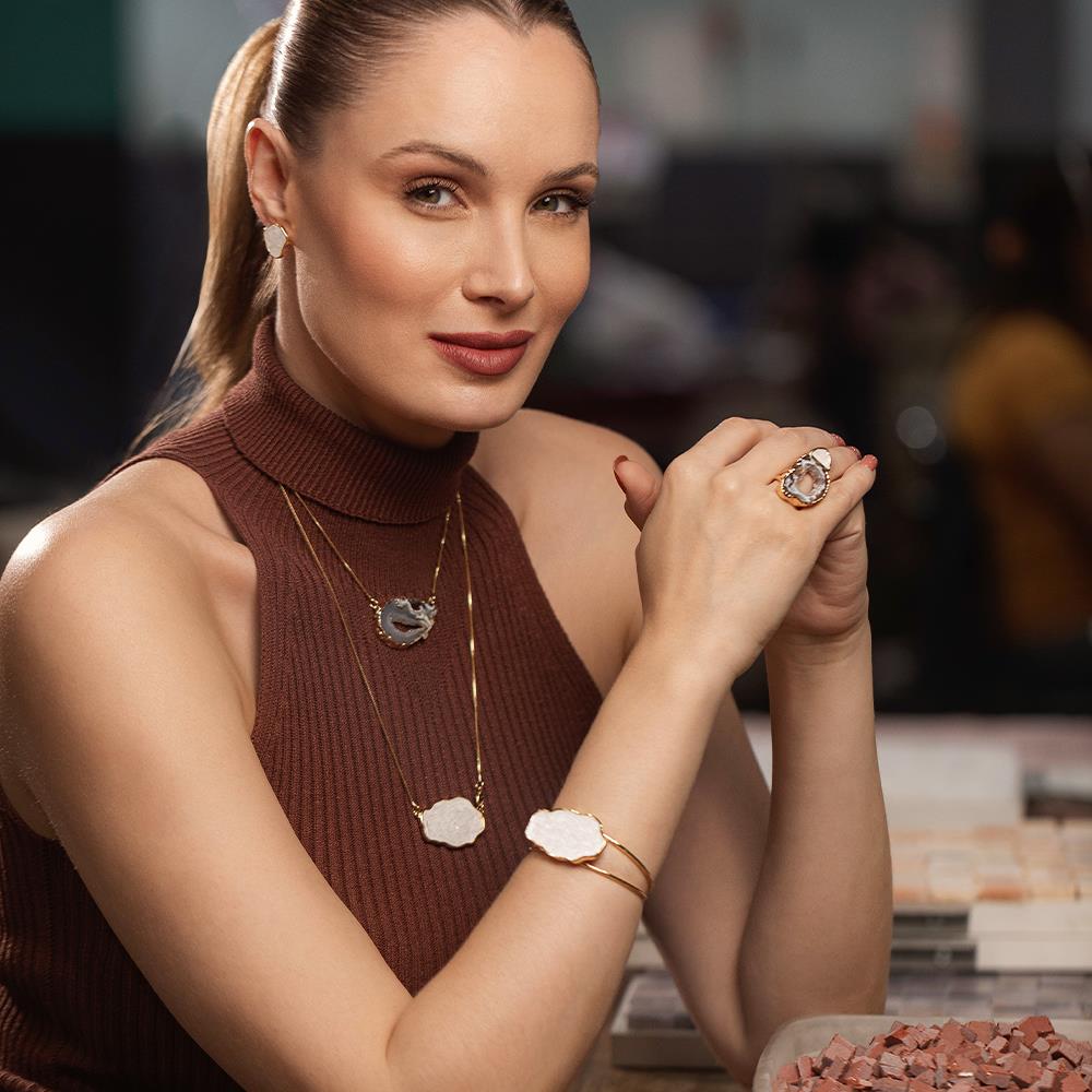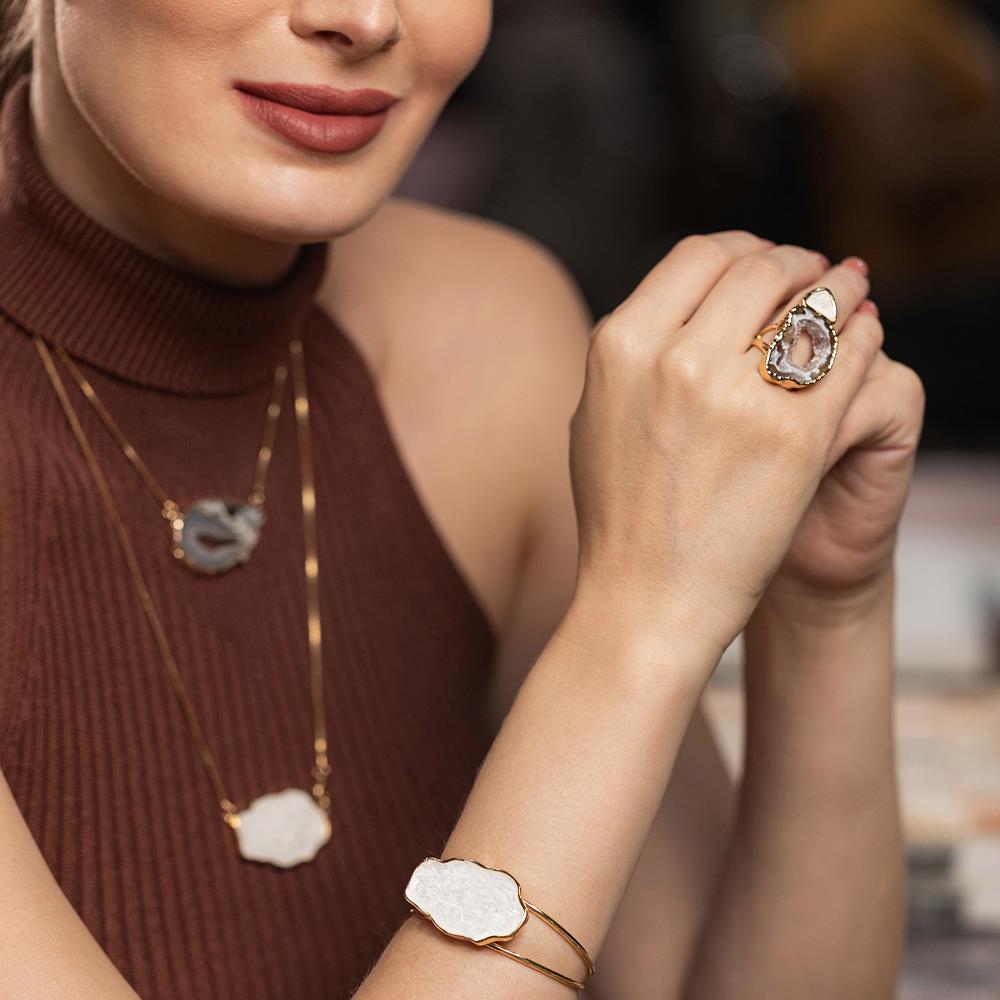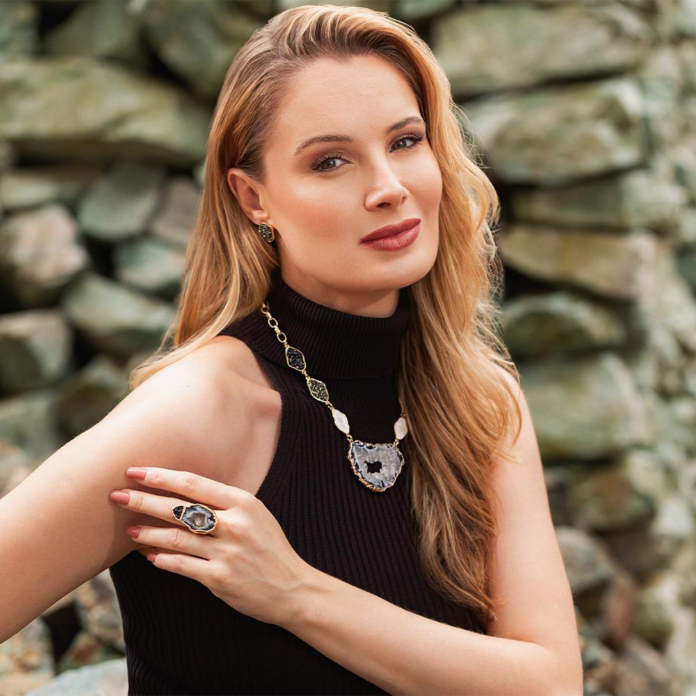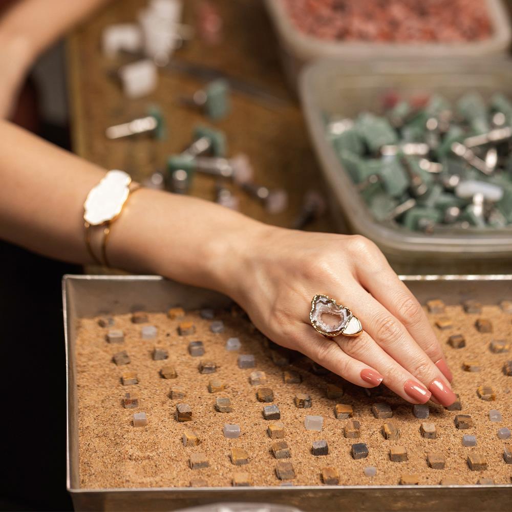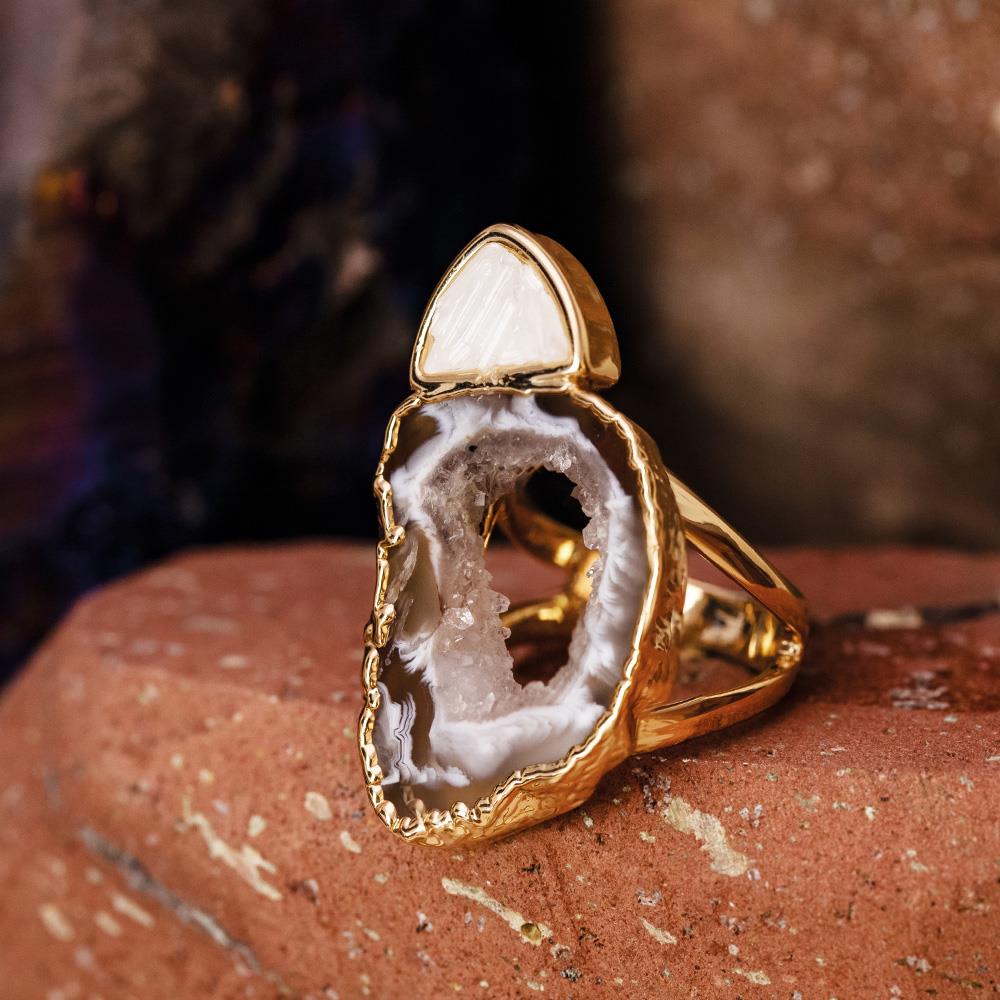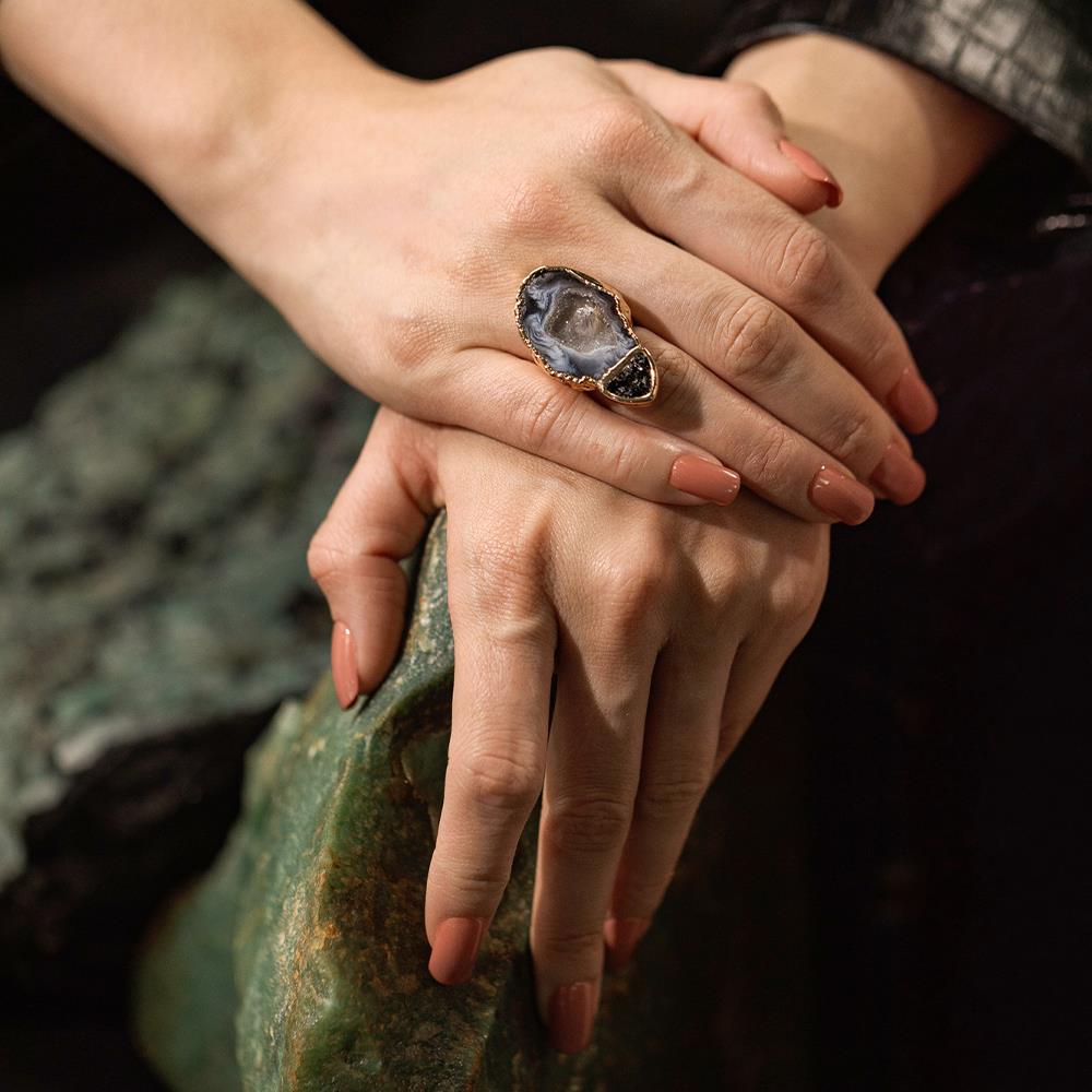 Este anel possui detalhes em pedras fragmentadas e pedra natural de geodo, extraida do interior de uma ágata, possuindo detalhes em drusa, com formato e tamanhos variados, tornando-se assim uma peça única.