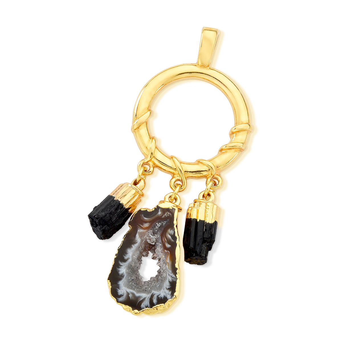 Pingente avulso, sem corrente, com três pedras, sendo duas de turmalina negra bruta e uma de geodo natural, com tamanhos e formatos variados.