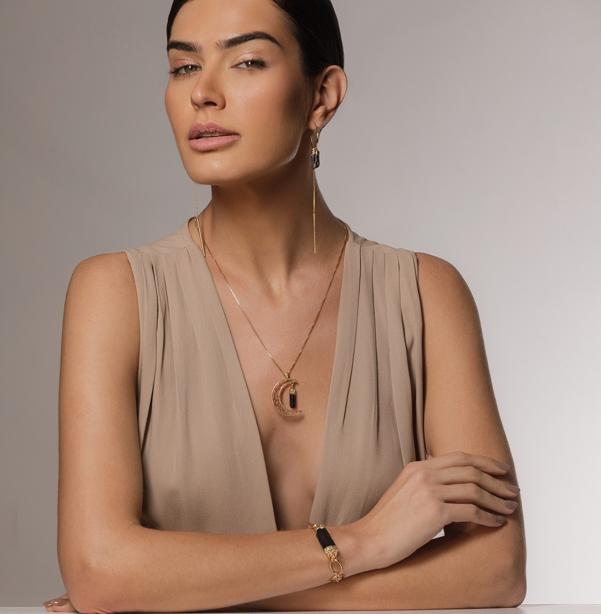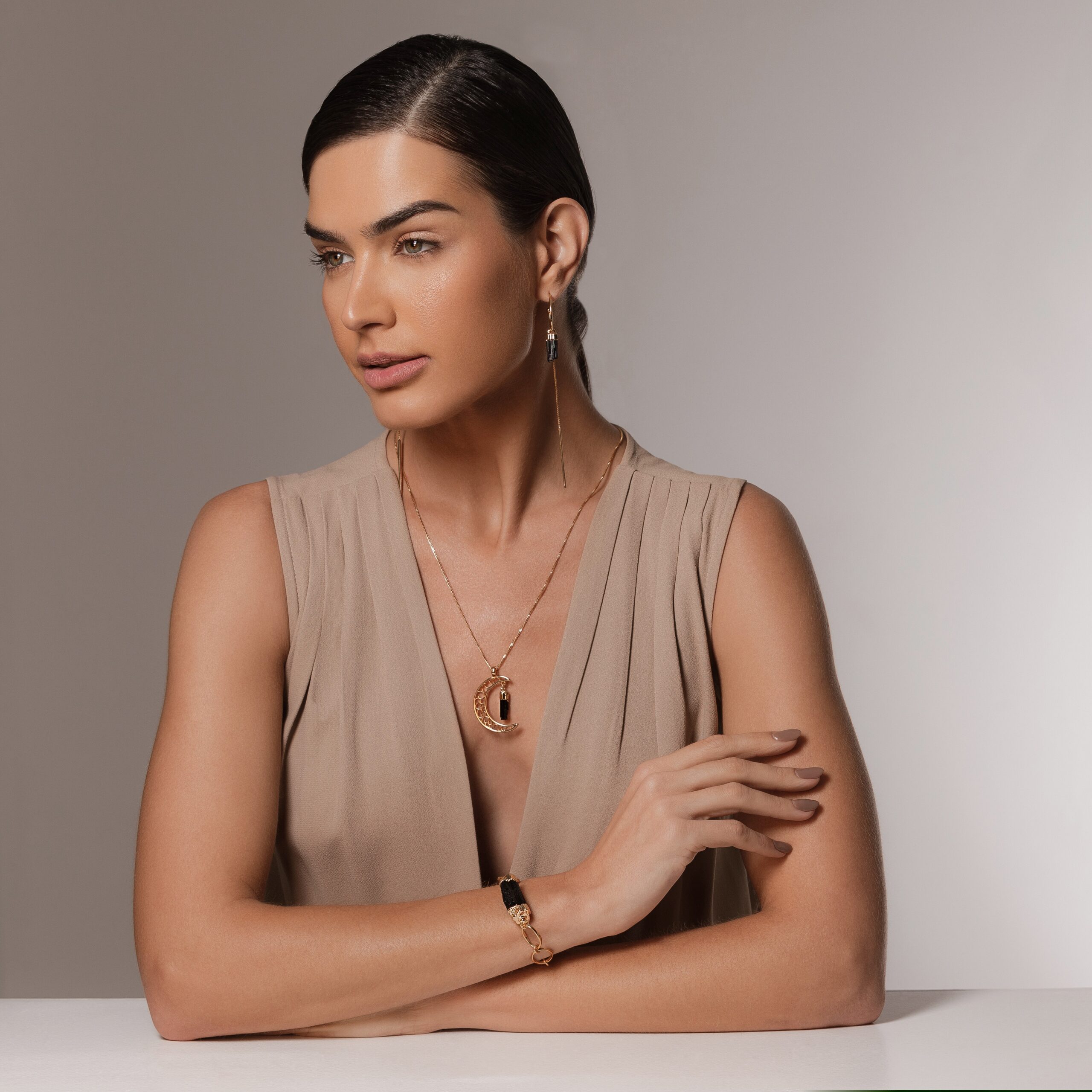 Pulseira com pedra natural de turmalina negra bruta, com formato e tamanhos variados.